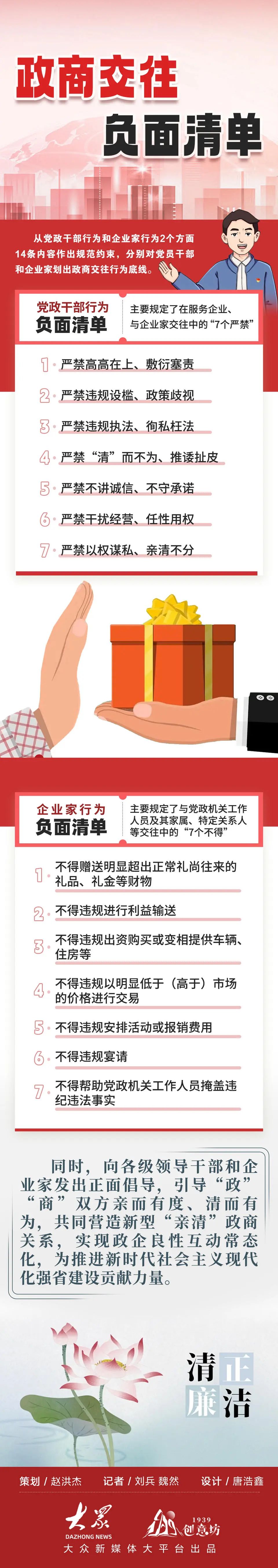 为深入贯彻落实党的二十大精神和习近平总书记关于构建亲清政商关系的重要论述,根据省委要求,近日,省纪委监委印发《政商交往负面清单》,从党政干部和企业家两方面作出规范约束,同时省工商联印发《清廉民企建设指导清单》,进一步优化营商环境和政治生态,鼓励领导干部积极主动服务企业发展,保护和激发经营主体活力,推动党政干部和企业家双向建立亲清统一的新型政商关系。