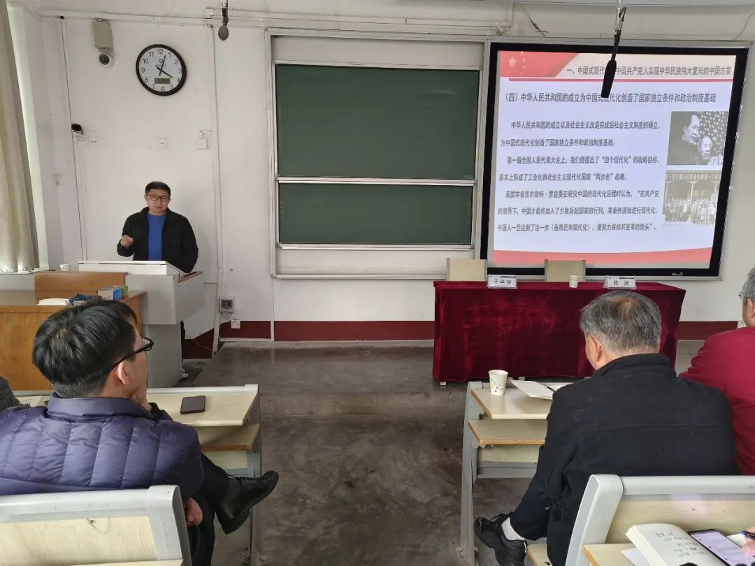 宣讲会开始,于学强院长分四个部分介绍了中国式现代化的政治宣言和时代纲领。一、中国式现代化是中国共产党人实现中华民族伟大复兴的中国方案。于学强院长讲到“中华人民共和国的成立以及社会主义改造完成后的社会主义制度的确立,为中国式现代化创造了国家独立条件和政治制度基础。”二、中国式现代化既有中国特质也为人类实现现代化提供了新的选择。他引用习近平总书记的一段话来强调中国式现代化是社会主义性质的现代化,中国式现代化是设计领域多、涵盖面广的系统工程。三、于院长指出中国共产党领导推进中国式现代化的历史进程分为“三步走”的发展战略和“三阶段”发展。四、以中国自身内源性动力开发全面推进中国式现代化的实践进程。最后,程波书记强调学院实现高质量发展就是我们落实好党的二十大精神的表现,希望每个人都扎扎实实的用自己的行动创造出优异的成绩和成果,落实好党的二十大精神,通过思想与实践的双向互动,为实现中华民族伟大复兴的中国梦勇毅前行。