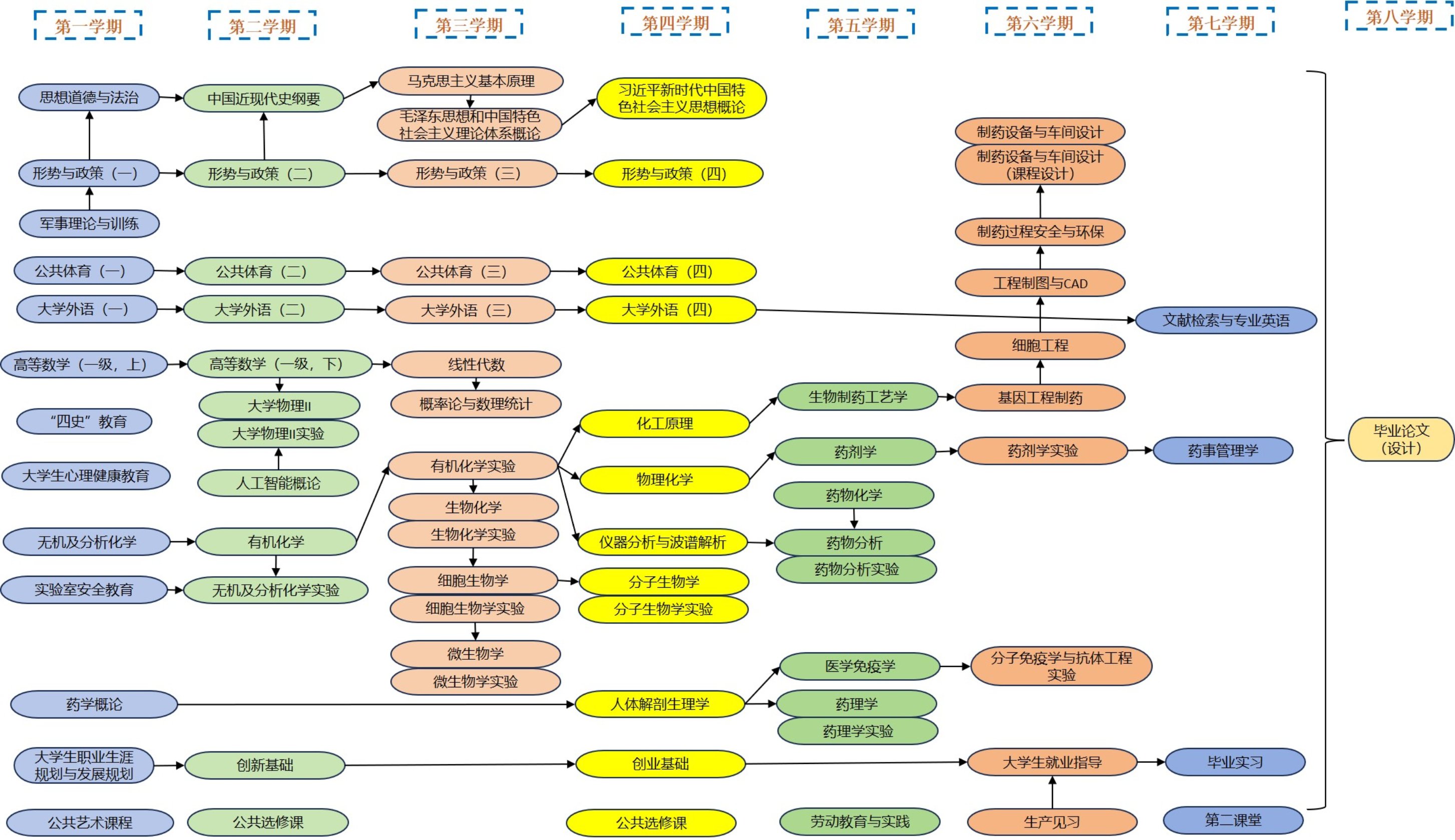 主要课程:高等数学、物理化学、无机及分析化学、有机化学、生物化学、细胞生物学、微生物学、医学免疫学、生物制药工艺学、药理学、药剂学、药物分析、基因工程制药、细胞工程、制药设备与车间设计、药事管理学等。