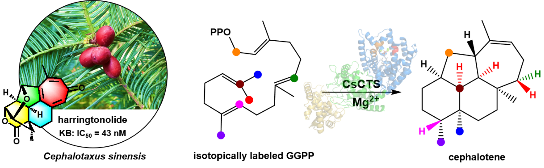 近日,亚色视频 王帅博士与中国医学科学院药物研究所戴均贵研究员团队合作以共同第一和通讯作者身份在国际顶级化学期刊Angewandte Chemie International Edition (Top Journals,IF: 16.6)在线发表了题为 “Functional Characterization and Cyclization Mechanism of a Diterpene Synthase Catalyzing the Skeleton Formation of Cephalotane-type Diterpenoids”的研究论文。该研究发现并功能鉴定了三尖杉烯合酶CsCTS,首次明确了海南粗榧内酯等三尖杉烷型二萜前体为三尖杉烯(cephalotene),并阐明了其环化机制。