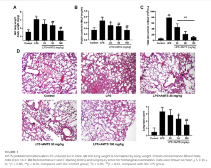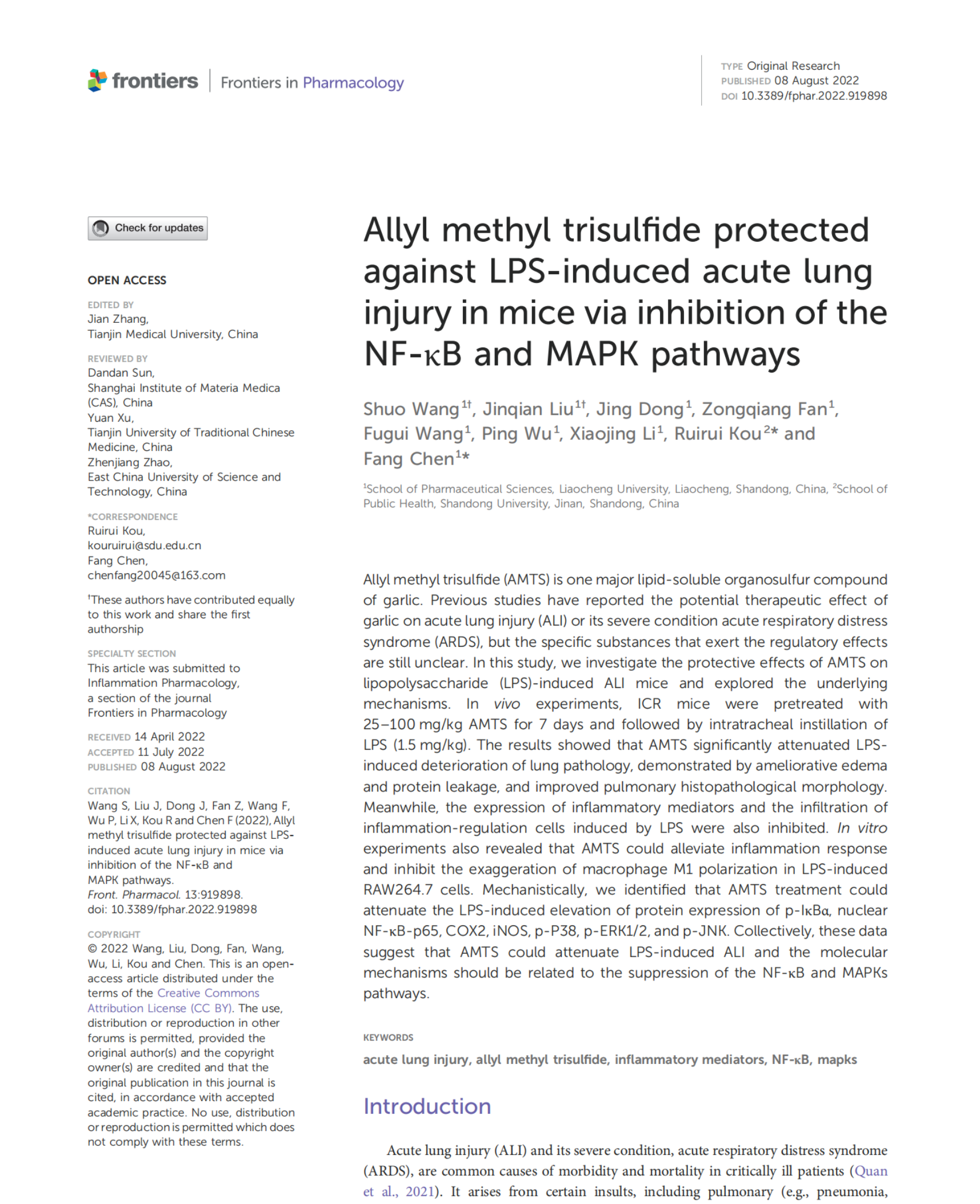 近日,药学院合成生物学与化学生物学创新团队的陈芳教授和王硕博士在《Frontiers in Pharmacology》杂志(中科院二区Top,IF=5.988)发表以“Allyl methyl trisulfide protected against LPS-induced acute lung injury in mice via inhibition of the NF-κB and MAPK pathways”为题的研究成果。王硕博士、硕士生刘晋倩为本论文的共同第一作者,陈芳教授和山东大学寇蕊蕊教授为共同通讯作者,亚色视频 为第一署名单位。