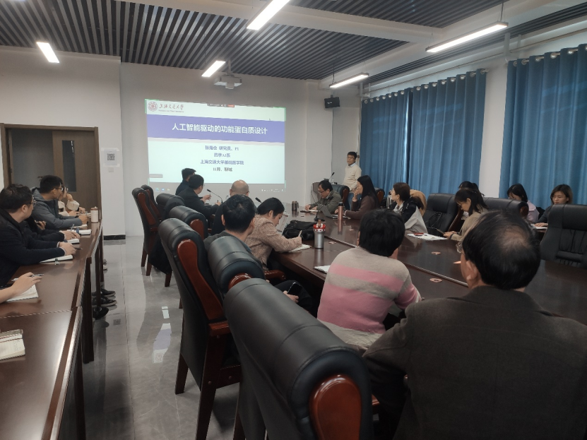 报告会上,张海仓首先系统介绍了天然蛋白质的基本特性、蛋白质设计的典型应用以及近十年来人工智能方法在该领域取得的突破性进展,全面解析了人工智能驱动功能蛋白质设计的关键技术路径。团队在该方向取得重要突破,基于自主开发的深度学习代表技术AlphaFold2与代表性工具ESM-2,实现了具有特定功能的全新蛋白质的“从头设计”与快速优化。该技术能够依据实际需求,精准生成高效塑料降解酶、靶向疾病治疗蛋白等新型功能分子。实验验证表明,AI设计的蛋白质性能优越。这一成果标志着蛋白质设计迈入智能化时代,有望为医药研发、绿色化工、新材料等领域提供创新解决方案,推动生物制造产业实现跨越式发展。随后,张海仓结合自身经验,为我校教师分享了基金申报的核心要点。他强调,申报需牢牢把握“创新性”与“可行性”两大关键:申报前应精准选择学科代码与项目类型,并夯实相关前期研究基础;标书撰写要注重讲述完整的科学故事,逻辑清晰,突出关键科学问题与研究的独特价值;研究方案应具体可行,并辅以扎实的预实验数据作为支撑。最后,他建议反复打磨文本,注重细节排查,避免任何形式的错误。在互动环节,张海仓与师生就蛋白质动态性、复杂性及实验验证中的瓶颈问题进行了深入交流。本次报告会内容极具前沿性,论述富有见地,现场学术氛围热烈,通过此次活动使亚色视频 教师深刻了解了人工智能驱动的功能蛋白质设计的前言研究进展,拓宽了亚色视频 科研人员的研究思路,同时为推动我校科研人员在人工智能与生物技术交叉领域与上海交通大学相关老师开展实质性合作奠定了坚实基础。