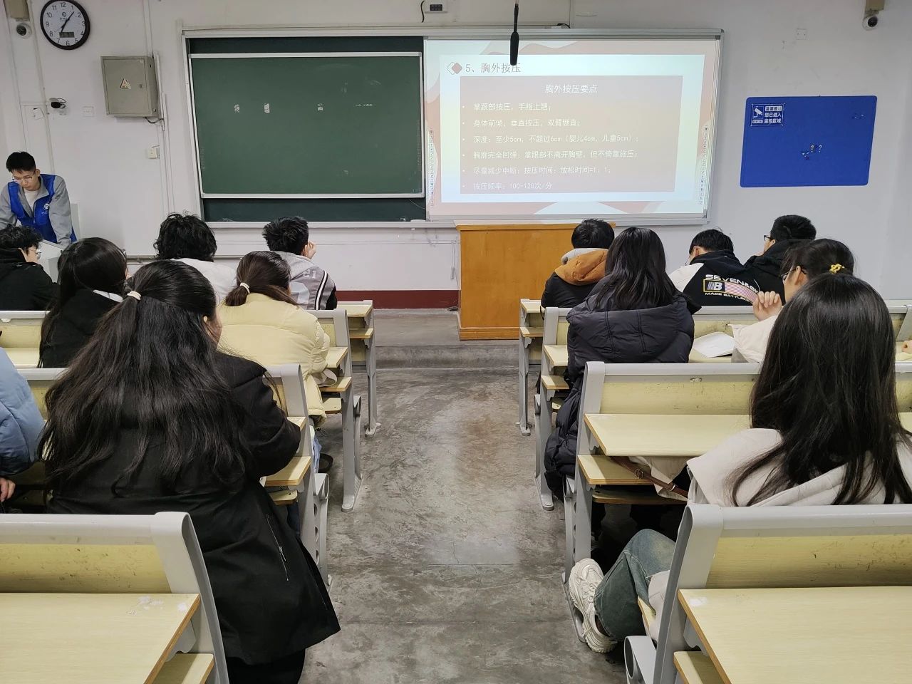活动伊始,团队成员通过人体模型演示,重点讲解心肺复苏术的关键步骤,对判断现场环境的安全稳定,如何确认患者有无意识和检查患者呼吸,颈动脉搏等应急处置方法做了要点解读,使学生在面对突发危险情况时,能够迅速做出呼救反应并精准地对患者进行急救。宣讲结束后,团队成员组织开展实践环节,学生纷纷上台进行心肺复苏模拟练习,团队成员在旁为学生提供详细的动作指导,纠正学生在心肺复苏的按压位置、深度、频率等方面出现的问题,以及规范人工呼吸急救的细节。经过系统的训练,学生逐渐掌握了心肺复苏的急救技巧。活动末尾,团队成员播放海姆立克急救法讲解视频,并结合人体模型实操,详细拆解动作要领,加深了学生对急救知识的理解,助力他们将理论知识转化为自救互救的实际能力。