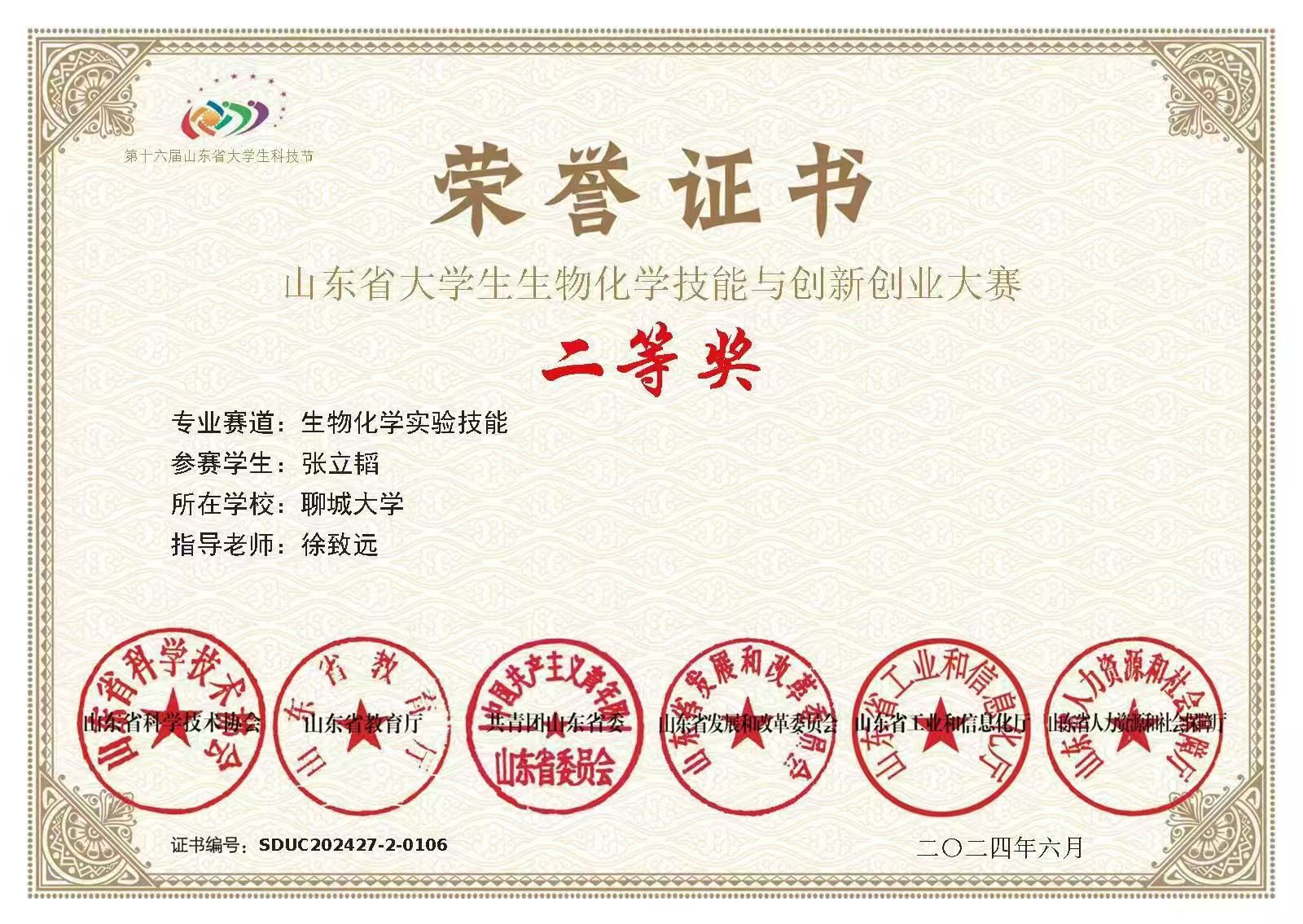 热烈祝贺亚色视频 张立韬荣获“山东省大学生生物化学技能与创新创业大赛(2024,创新创业类)”二等奖