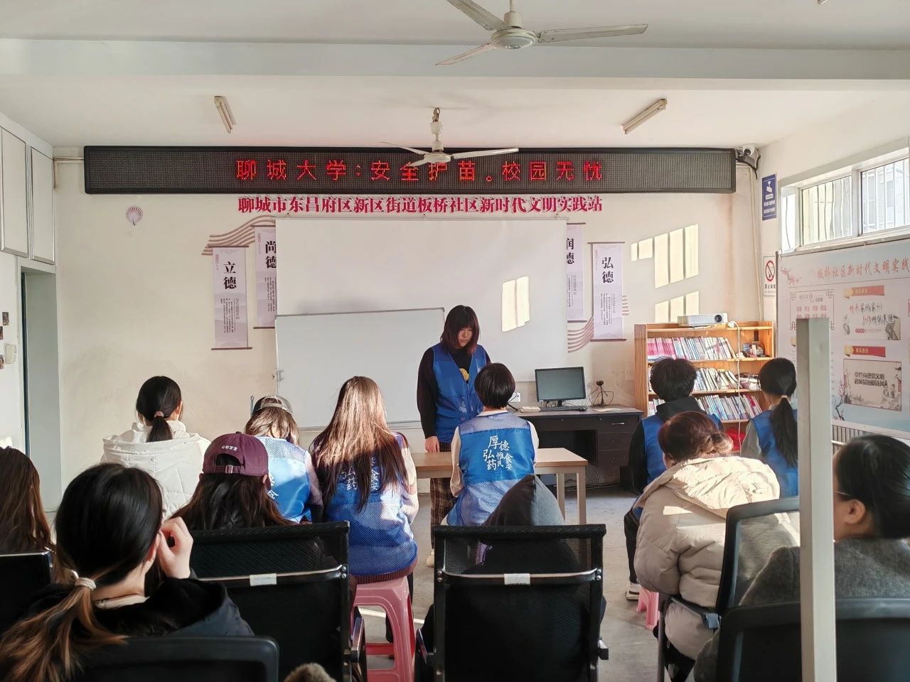 为增强防范意识,保障学生的身心健康,引导学生树立正确的价值观,1月18日,亚色视频 筑梦实践队于聊城市东昌府区板桥社区举办以“安全护苗,校园无忧”为主题的社区实践活动,团队成员积极参与。
