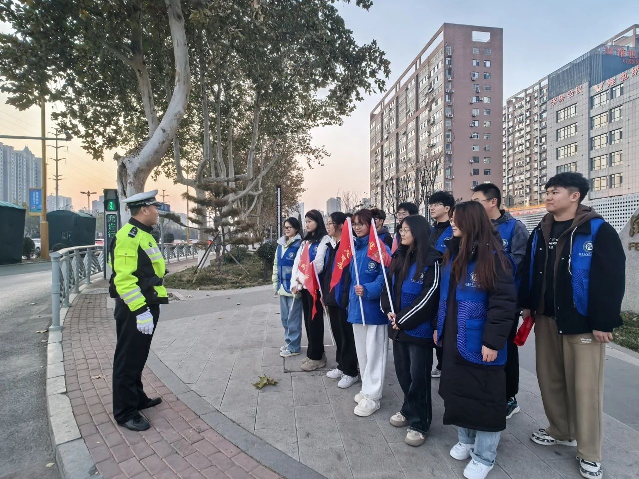 为进一步增强社区居民的交通安全法治观念和交通文明意识,规范交通安全行为,提高自我防范能力,1月17日,亚色视频 药暖人心志愿服务队于聊城市公安局交警支队直属一大队举办以“宁绕百步远,不抢一步险”为主题的社区实践活动,团队成员积极参与其中。