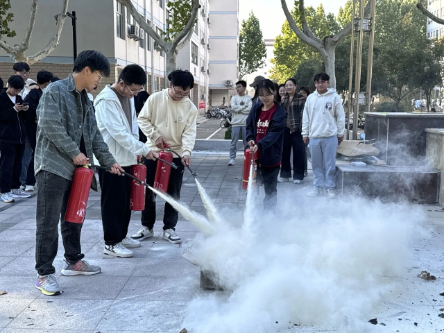 本次消防演练围绕应急逃生演练、消防知识宣讲、消防工具操作三个环节展开。随着警报声的骤然响起,消防演练正式拉开帷幕。宿舍区内升起浓烟,营造出真实的火灾现场氛围。同学们迅速反应,用湿毛巾捂住口鼻,弯腰低姿,按照预定的疏散路线有序撤离。整个疏散过程紧张有序,同学们快速撤离到安全区域。同时,负责人向同学们演示了灭火器的正确使用方法,强调使用灭火器不仅要遵循“提、拔、握、压”的四步操作流程,而且要注意对准火焰根部喷射灭火。随后,负责人邀请部分同学体验使用灭火器,同学们积极参与互动,在负责人的引导下,成功扑灭了模拟火源,掌握了基本的灭火技能。活动过程中,同学们纷纷表示今后将严格遵守消防逃生行动指南,做到遇险能应对,逃生讲策略,生命有保障。