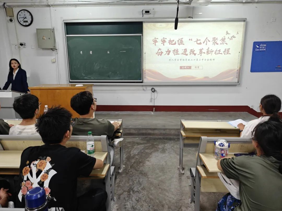 活动伊始,杨倩以“牢牢把握‘七个聚焦’,奋力推进改革新征程”为主题,深入解读了党的二十届三中全会精神。她指出,全会审议通过的《中共中央关于进一步全面深化改革、推进中国式现代化的决定》中提出的“七个聚焦”改革任务,涵盖了经济、政治、文化、社会、生态、安全以及党的领导等多个方面,同时对进一步全面深化改革的总目标作出了部署安排。杨倩强调,“七个聚焦”对进一步全面深化改革具有重大意义,是实现中国式现代化的重要保障和本质要求。当代青年应深刻领会“七个聚焦”的内涵,将其作为成长的指引,以开拓的视野和奋进的姿态,迎接新时代的挑战。宣讲结束后,学生们纷纷表示将积极响应号召,秉持使命担当,以实际行动践行初心使命,为推进中国式现代化进程贡献自己的力量。