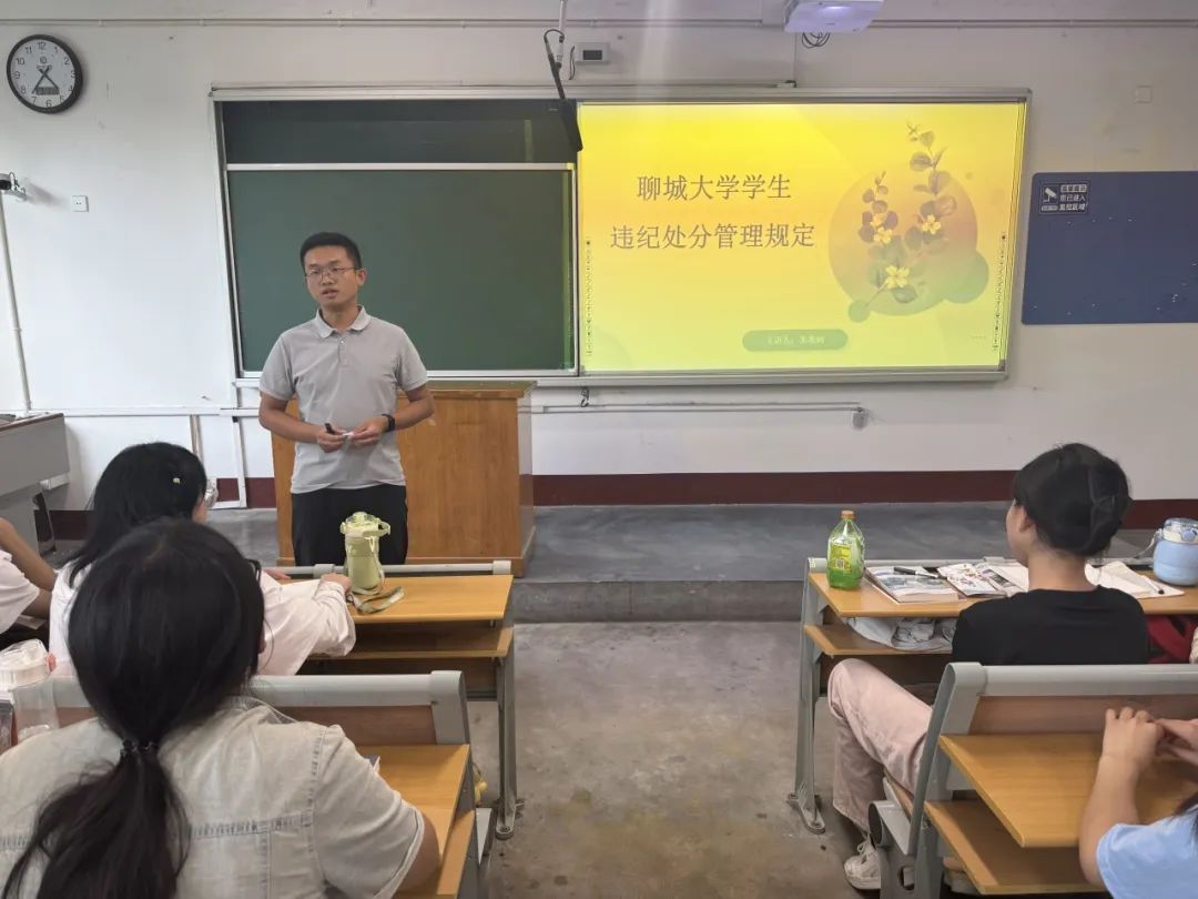 为加强亚色视频 学生的教育与管理工作,进一步完善学生管理规章制度体系,帮助新生更好的适应大学生活,9月2日,亚色视频 于亚色视频 东校区2#209举办2024级新生违纪处分管理规定入学教育,此次教育课由辅导员朱兆阔担任主讲人。