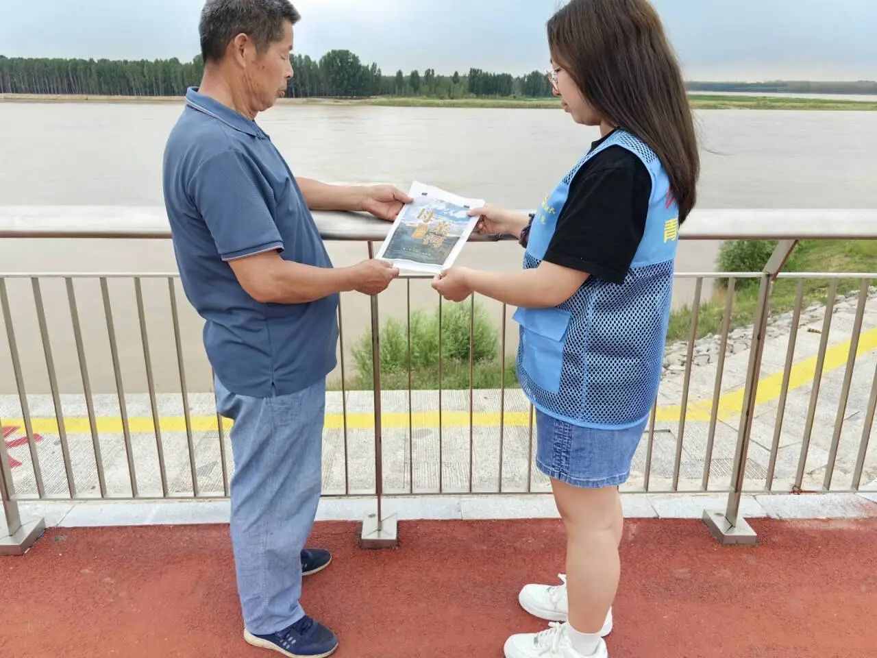 团队成员于黄河口进行实地考察,他们手持垃圾袋、夹子等工具,沿着黄河边,细心清理着河岸两侧的垃圾与杂物,从塑料袋到饮料瓶,无一遗漏。同时团队成员发放宣传彩页,利用宣传彩页向游客普及《黄河保护法》相关内容,团队成员结合自己制作的“护黄知识”PPT具体案例向游客讲解保护母亲河的重要性和措施,引导游客保护好、传承好、弘扬好黄河文化。最后,通过专业人员的讲解,团队成员对于黄河生态保护现状以及《黄河保护法》的相关内容进行了充分地学习。