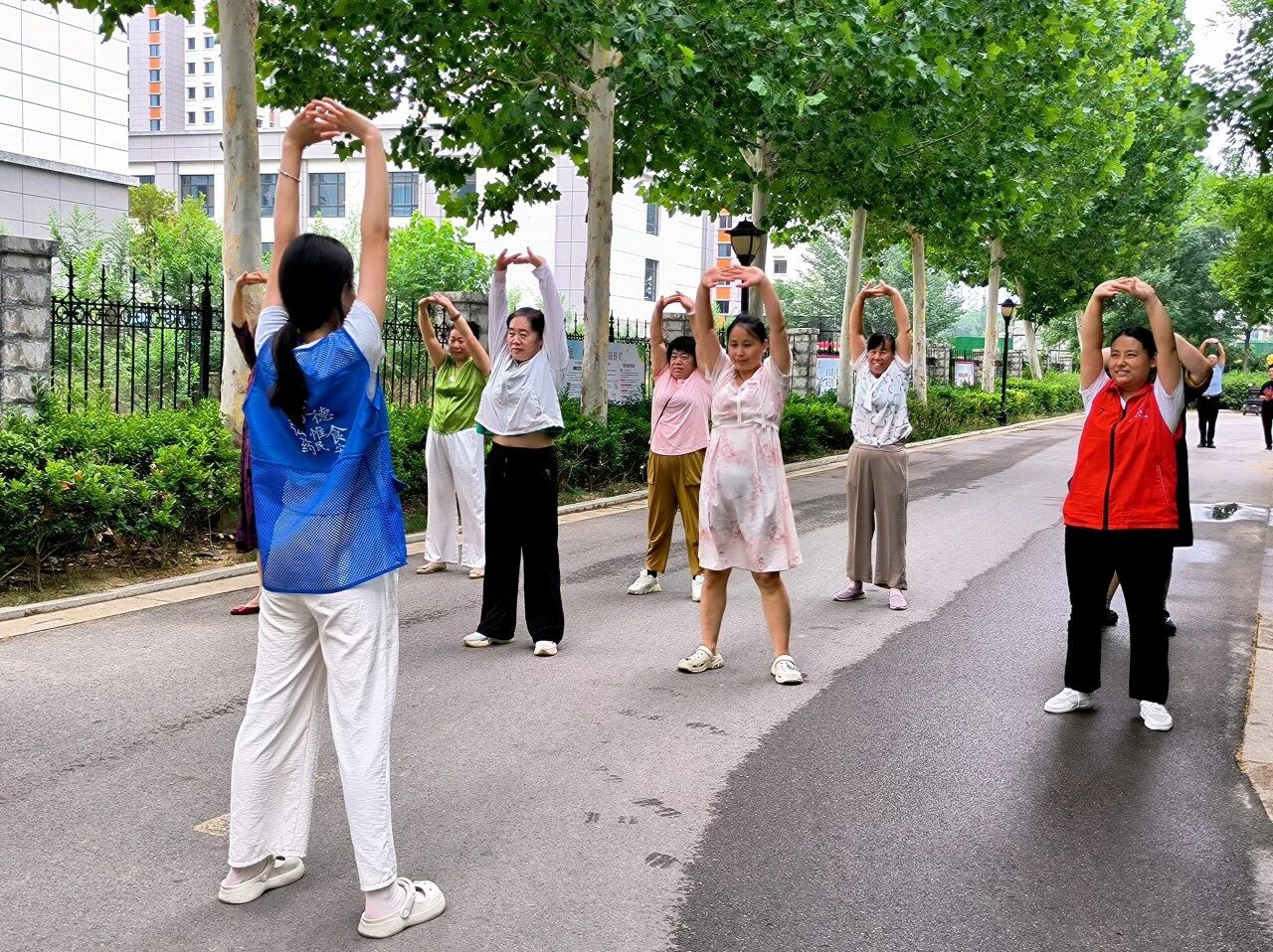 活动伊始,团队成员向社区居民系统介绍了八段锦的历史渊源以及其强身健体的基本原理,着重阐释其在调节气血、舒缓压力、增强免疫力等方面的功效,并结合药学专业知识,深入讲解该功法对慢性病预防的积极作用。随后,两名团队成员进行了规范的动作示范与分解教学,详细说明每式动作的要领及呼吸配合的注意事项,引导居民跟随练习。其余成员则分组对居民进行一对一动作指导与纠正,确保教学效果,现场形成浓厚的学习氛围。活动最后,团队成员组织社区居民进行互动交流,邀请练习成效突出的居民分享实践经验,并鼓励全体参与者相互交流心得感悟,进一步深化了居民对八段锦的理解与实际运用能力。