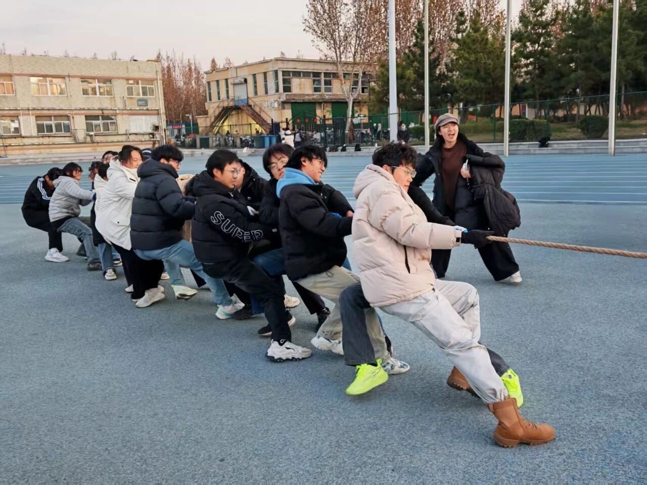 为丰富学生课余生活,培养学生的团队协作意识,12月4日,亚色视频 于田径场举办“聚力杯”拔河比赛,2025级学生积极参与其中。