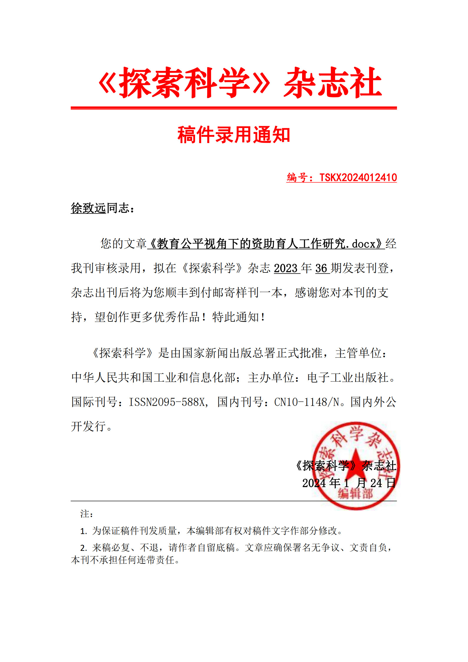 亚色视频 辅导员在《探索科学》杂志发表资助育人工作文章
