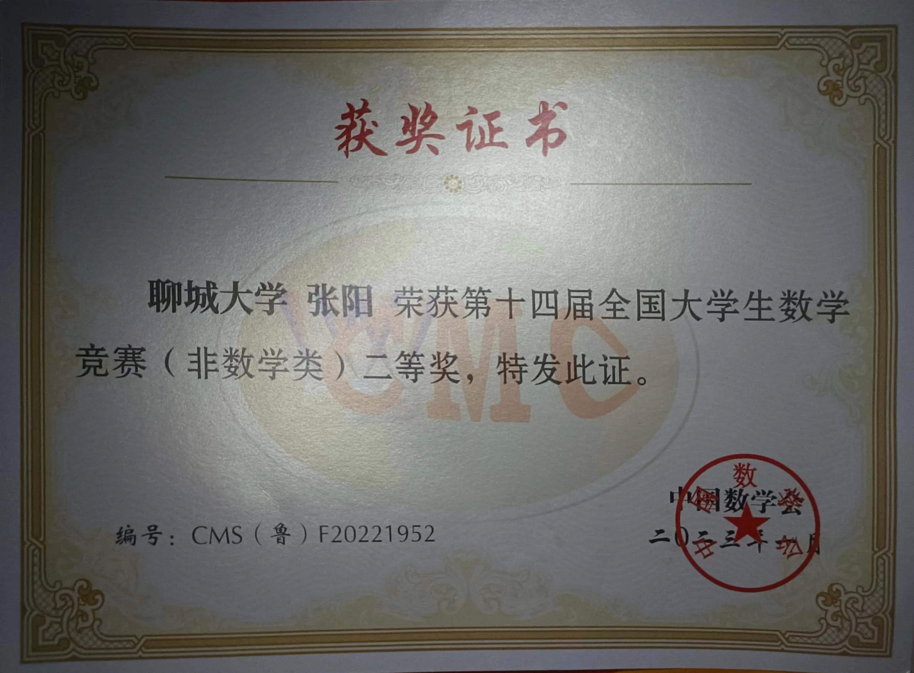 热烈祝贺药学院张阳荣获“全国大学生数学竞赛(非数学类)”二等奖