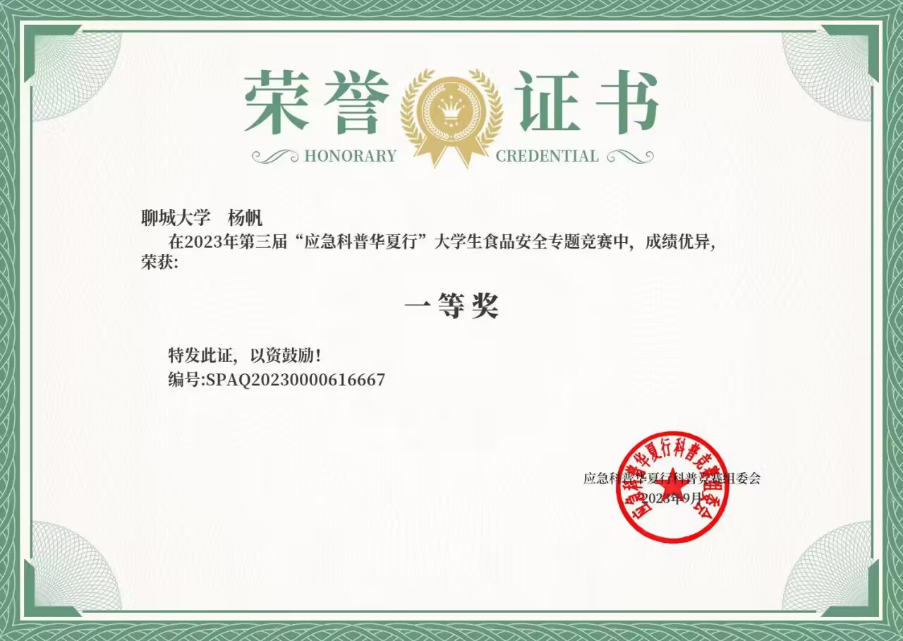 热烈祝贺药学院杨帆荣获2023年第三届“应急科普华夏行”大学生食品安全竞赛一等奖