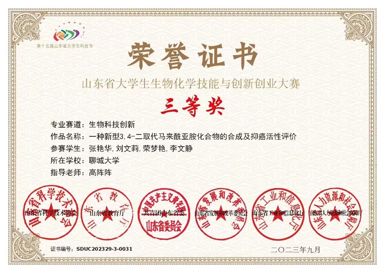 热烈祝贺药学院刘文莉荣获“山东省大学生生物化学技能与创新创业大赛”三等奖
