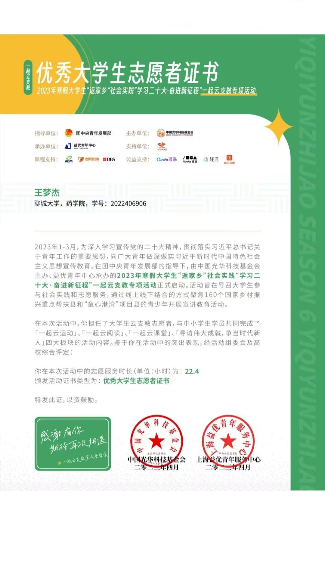 热烈祝贺药学院王梦杰荣获“一起云支教”优秀大学生志愿者证书