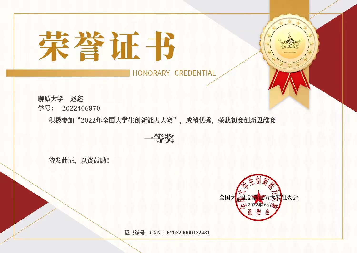 热烈祝贺药学院赵鑫荣获“2022年全国大学生创新能力大赛”一等奖