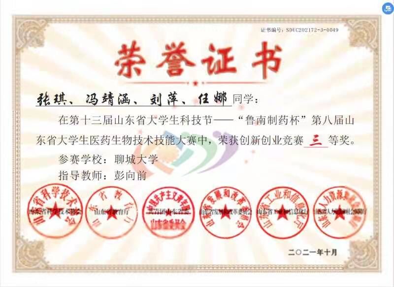 热烈祝贺药学院任娜荣获第十三届山东省大学生科技节“鲁南制药杯”第八届山东省大学生医药生物技术技能大赛创新创业竞赛三等奖
