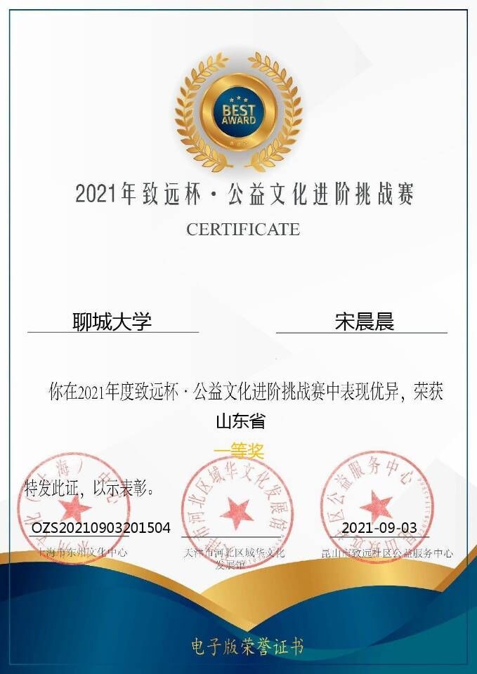 热烈祝贺药学院宋晨晨荣获2021年致远杯·公益文化进阶挑战赛 一等奖