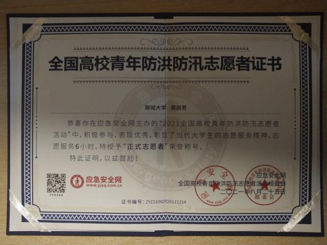 热烈祝贺药学院慕丽君荣获全国高校青年防洪防汛志愿者证书