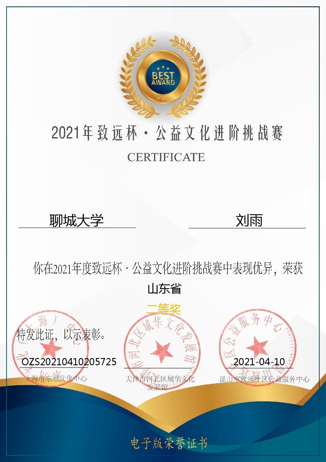 热烈祝贺药学院刘雨荣获致远杯进阶文化挑战赛二等奖