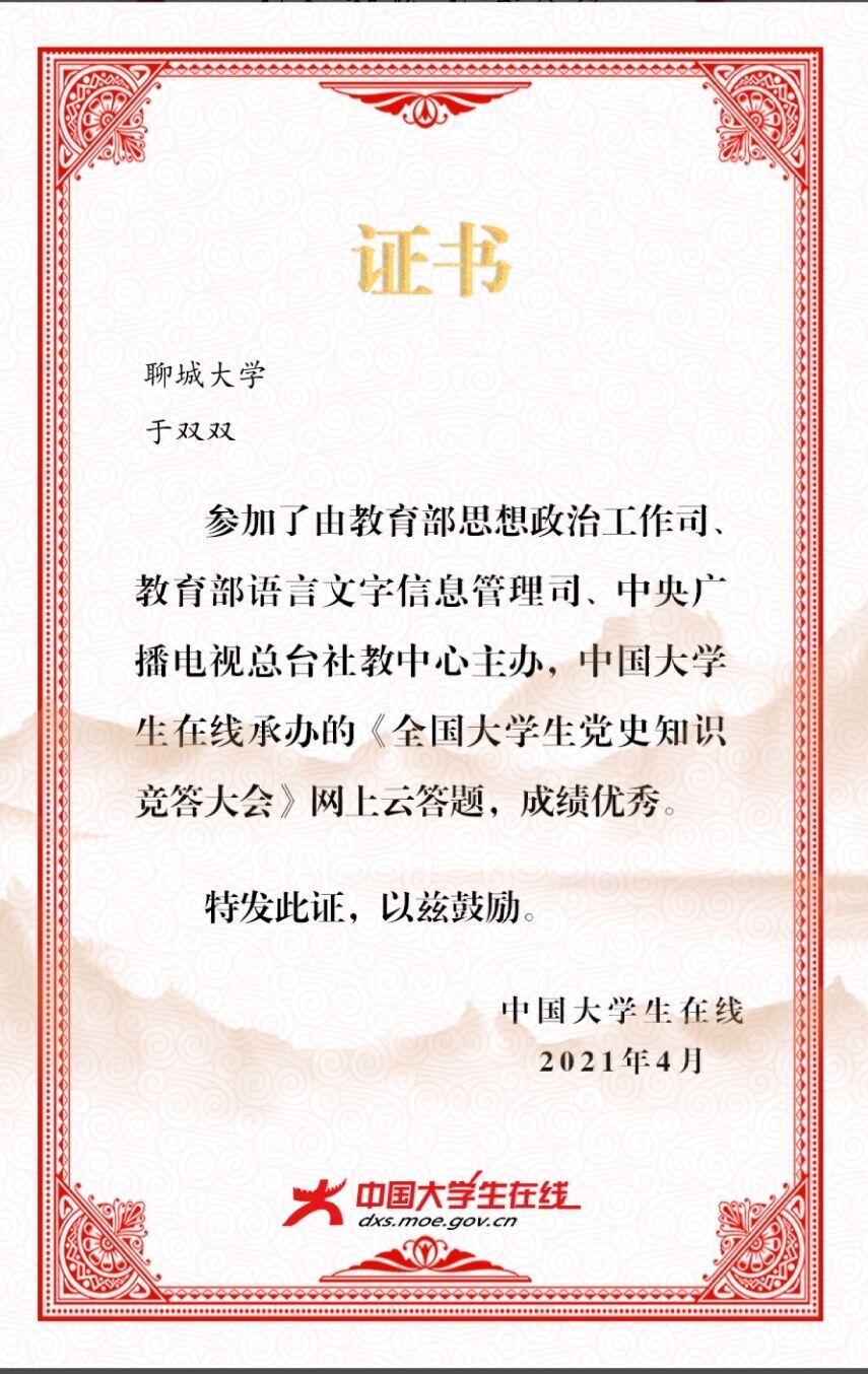 热烈祝贺药学院于双双荣获全国大学生党史知识竞答大会网上云答题优秀奖
