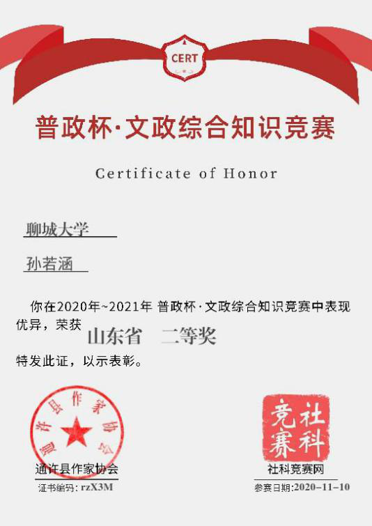 亚色视频 孙若涵获“普政杯文政综合知识竞赛”二等奖