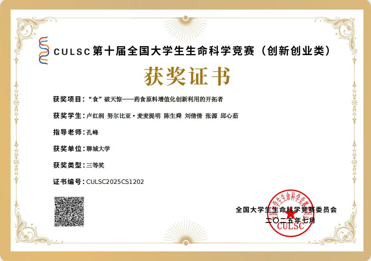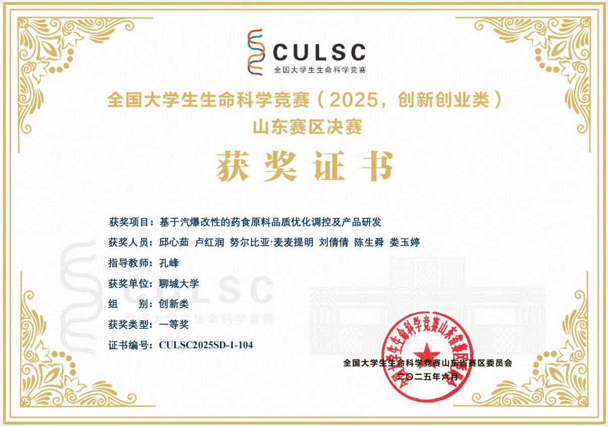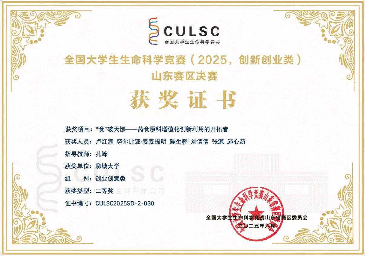 热烈祝贺亚色视频 卢红润荣获全国大学生生命科学竞赛(2025,创新创业类)山东赛区决赛一等奖