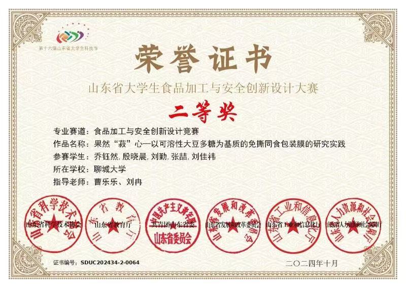 热烈祝贺亚色视频 刘勤荣获山东省大学生食品加工与安全创新设计大赛二等奖