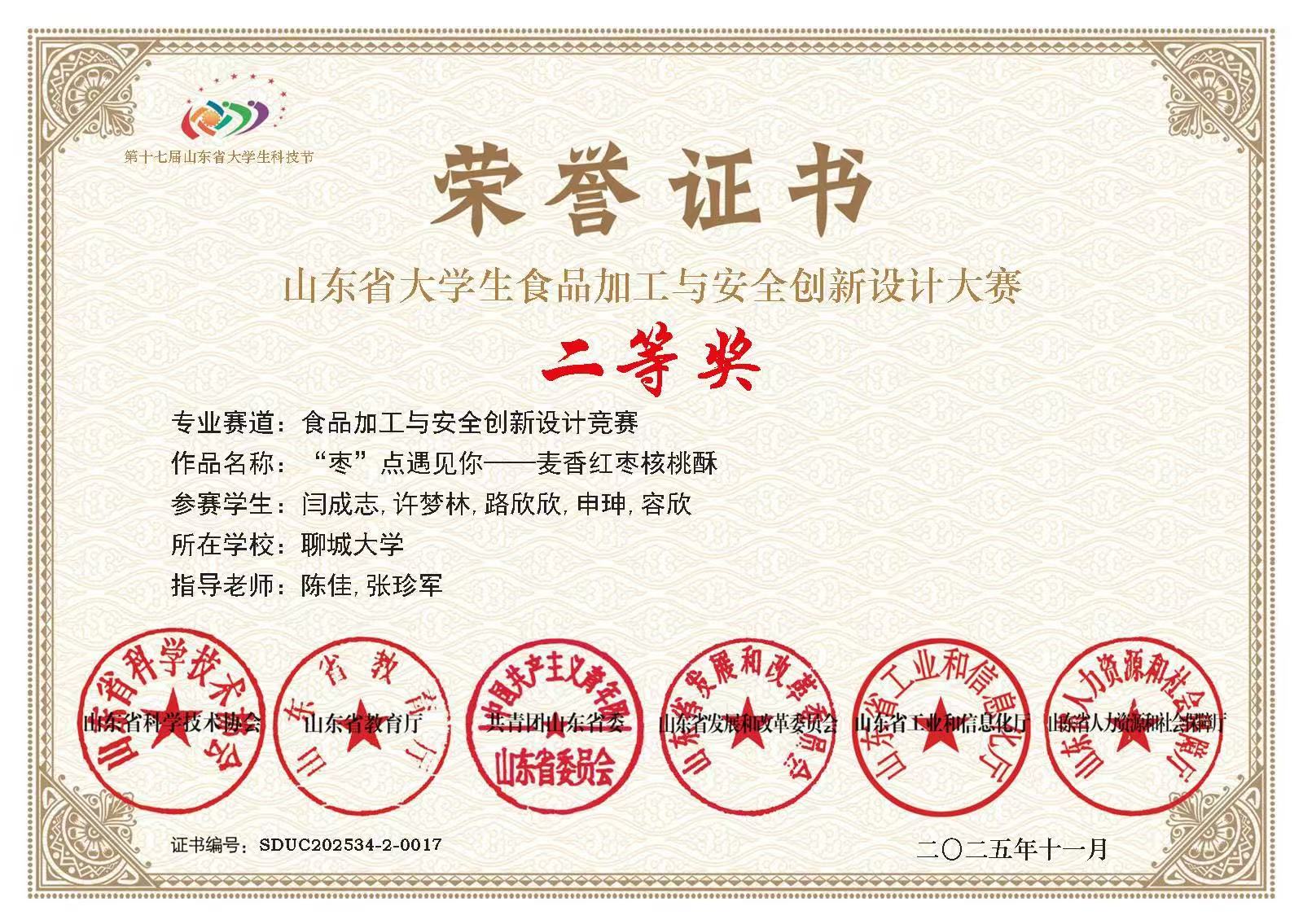 热烈祝贺亚色视频 申珅荣获山东省大学生食品加工与安全创新设计大赛二等奖