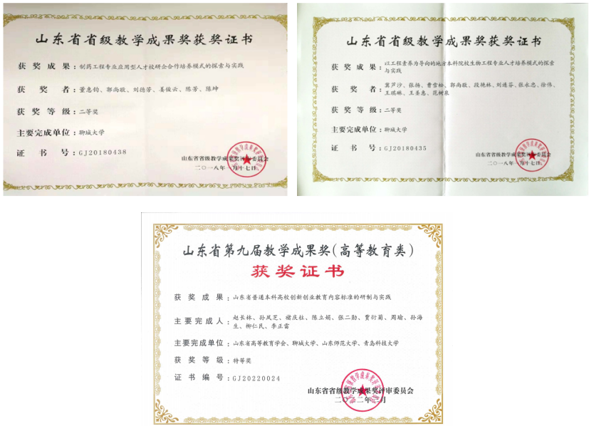 学院建设了《生物化学》、《药理学》、《药剂学》、《药物分析》和《药物化学》5门在线开放课程,其中,《生物化学》课程获批国家一流本科课程。本专业教师参加省部级教学竞赛8项,其中获国家级二等奖1项,三等奖2项,优秀奖1项。学院获山东省本科教学成果特等奖1项,二等奖2项。