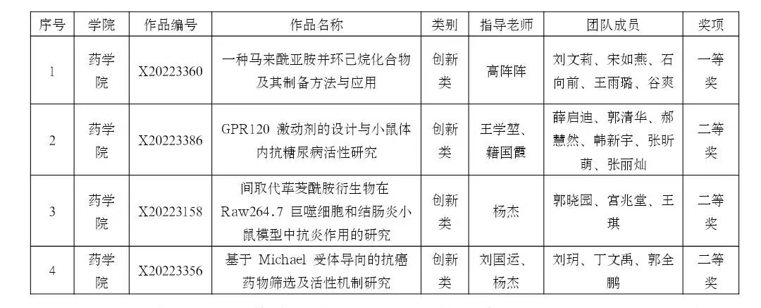 本次决赛覆盖全国各省、自治区、直辖市及香港、澳门等多个地区的400余所高校,参赛作品5053项,通过资格审查和初复赛网评,入围公开决赛项目555项,其中创新类项目315项,创业类项目240项,亚色视频 高阵阵老师指导的《一种马来酰亚胺并环己烷化合物及其制备方法与应用》(创新类)脱颖而出,进入全国总决赛,并斩获一等奖,杨杰老师指导的《间取代荜茇酰胺衍生物在Raw264.7 巨噬细胞和结肠炎小鼠模型中抗炎作用的研究》和王学堃老师指导的《GPR120 激动剂的设计与小鼠体内抗糖尿病活性研究》以及刘国运老师指导的《基于 Michael 受体导向的抗癌药物筛选及活性机制研究》(创新类)获得二等奖。在比赛现场答辩中,面对各位评审专家的犀利提问,亚色视频 学子沉着冷静,有条不紊地进行作答,展示出扎实的基本功和特色鲜明的创新理念及良好的团队形象。