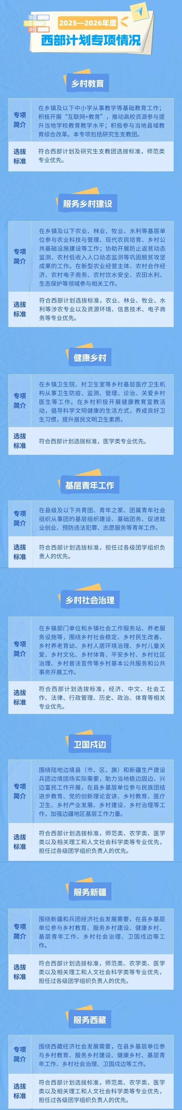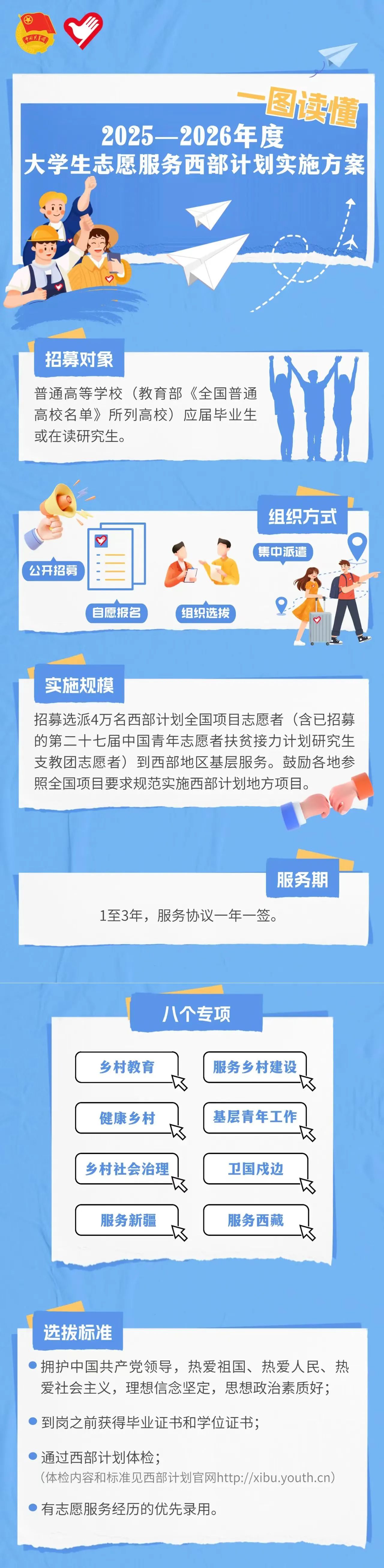 3月1日至5月10日,2025年普通高等学校应届毕业生或在读研究生,可通过微信公众号“西部志愿汇”(菜单栏中的“我要报名”)或登录西部计划官方网站(//xibu.youth.cn),在西部计划报名系统中注册报名。