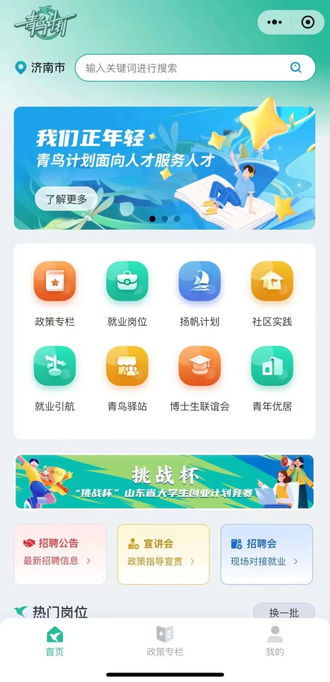 “青鸟计划”是团省委和省人力资源和社会保障厅共同开展的服务大学生就业、助力全省“招才引智”工作大局的一项工作。立足联系齐鲁学子的纽带、服务招才引智的窗口、汇集智力资源的平台三大定位,以实习实践、高质量就业、“双创”空间和校地合作为四大支撑,吸引青年学子和人才来鲁干事创业。